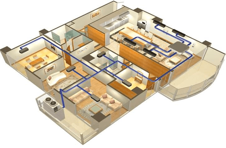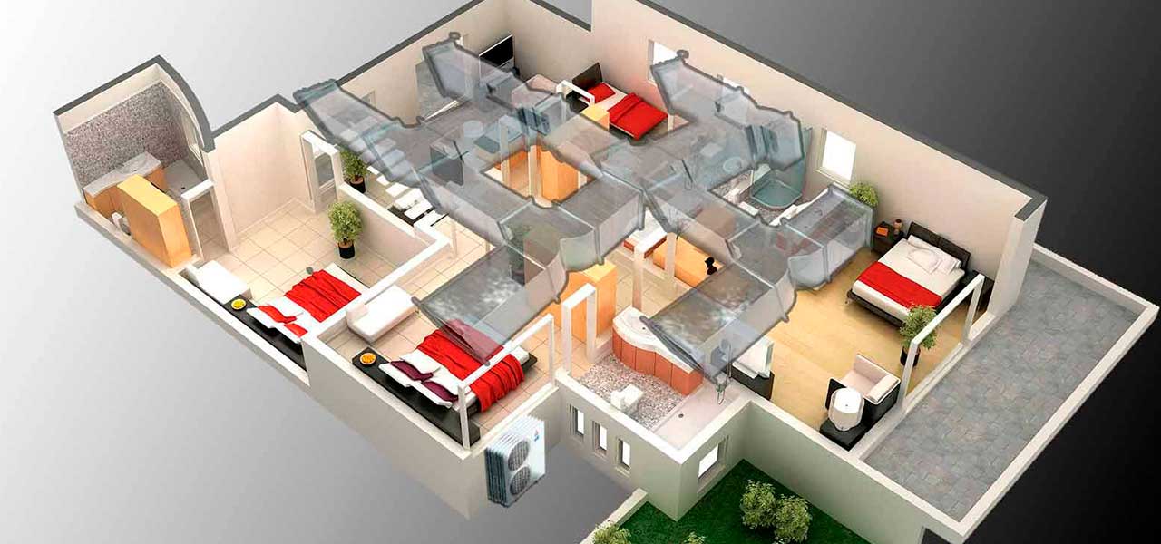 La climatización de todas las estancias de la vivienda se realiza mediante conductos y rejillas. Está formado por una unidad exterior y una unidad interior que se conecta a las habitaciones mediante una red de conductos que se instalan en el falso techo. Este sistema se suele utilizar en viviendas de nueva construcción y proyectos de reformas en viviendas.